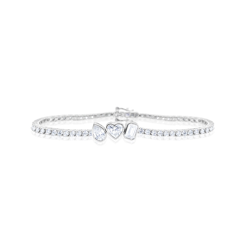 14kt White Gold Tennis Bracelet with Bezel Set Emerald Heart and Pear Shaped Diamonds