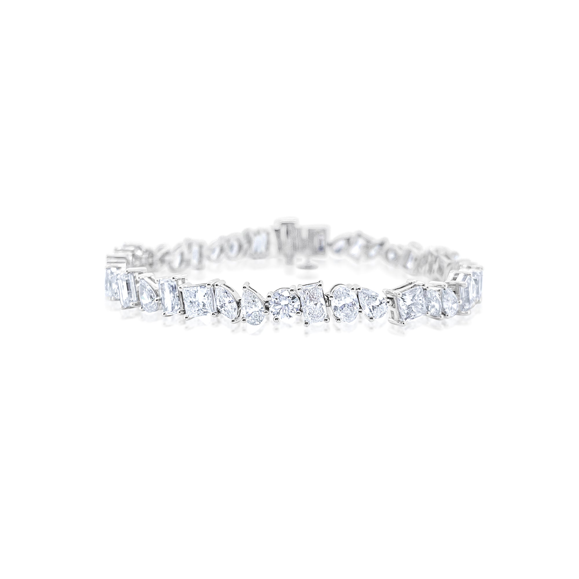 Elevate your jewelry collection with this stunning 14kt white gold bracelet, featuring a captivating marquis emerald as its centerpiece. Complemented by a harmonious blend of pear, oval, and round lab-grown diamonds totaling 10.49 carats, this piece combines timeless elegance with modern sophistication. The brilliant white gold setting enhances the emerald's rich, verdant hue while the lab-grown diamonds deliver exceptional sparkle and clarity at a more accessible price point. Perfect for special occasions or everyday luxury, this bracelet makes a bold statement while maintaining refined grace. An investment piece that transcends trends and celebrates your distinctive style.